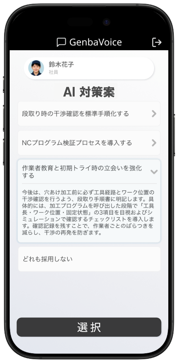 AIが報告内容をもとに、複数の対策案を自動生成。最も適切な案を選ぶだけで、報告が完成します。