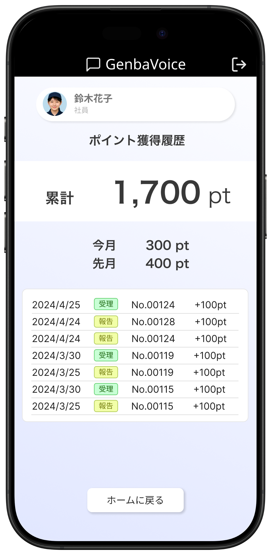 報告時と受理時にポイントが貯まります。続けやすい仕組みにより、現場の声が自然に集まります。